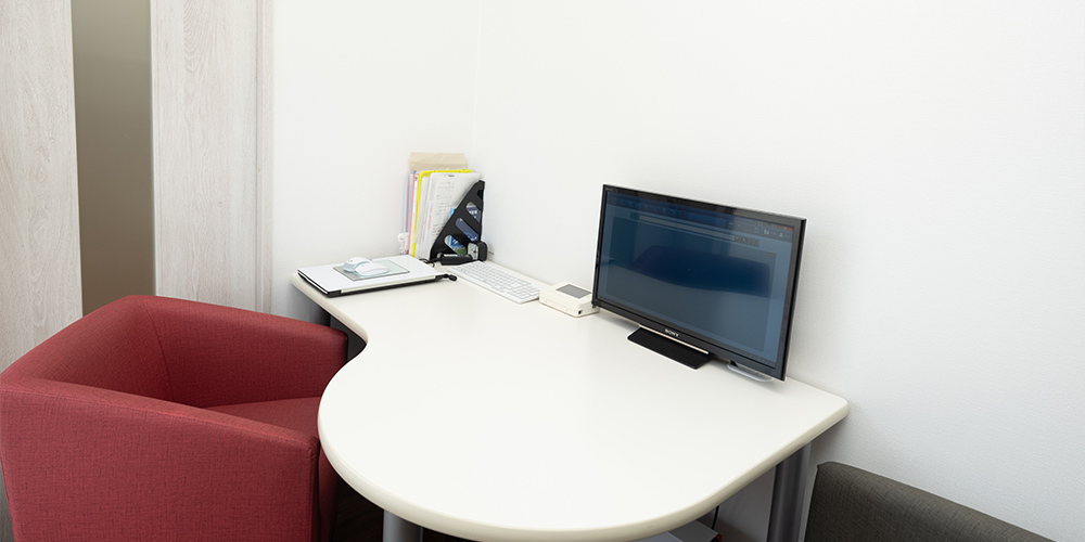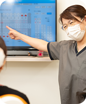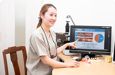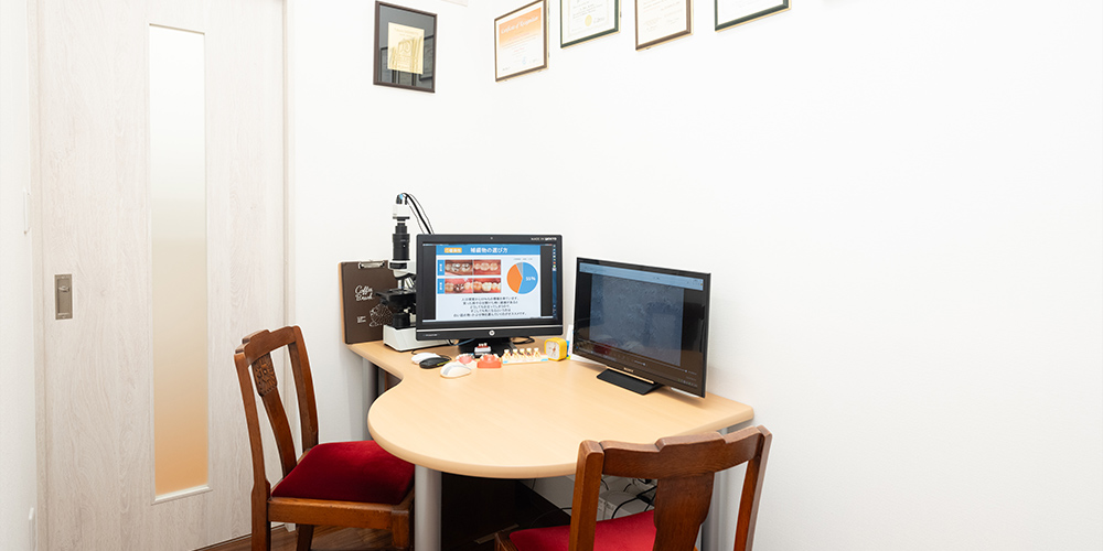 歯科受診に不安を感じるかたにも、安心して通っていただけるよう、患者さんに寄り添った診療を大切にしています。治療の際には、痛みに配慮した丁寧な対応を心がけ、できる限り負担を抑えられるよう努めています。また、症状や治療方針については、資料を用いてわかりやすくご説明し、プライバシーに配慮したカウンセリングルームで落ち着いて相談いただける環境を整えています。