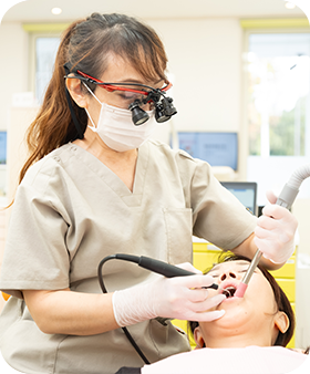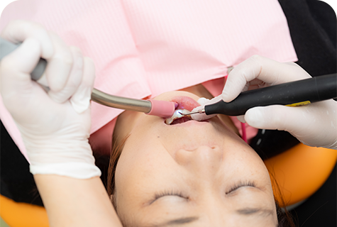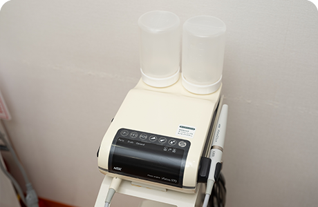 通常の歯周病治療に加え、お薬を用いた治療や、殺菌力の高い高濃度次亜塩素水によるクリーニング、エアフローを使った負担の少ない歯石除去などを、組み合わせて提供します。