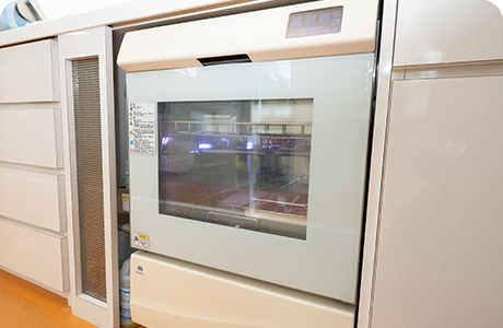 当院では、院内感染のリスクをできる限り抑えるため、衛生管理に力を入れています。患者さんに安心して受診いただけるよう、ガラス張りの滅菌コーナーを設置し、高性能な機器を用いた滅菌処理を徹底しています。また、コップやグローブなどは使い捨て製品を採用し、使用ごとに交換することで清潔な環境を保っています。日々の診療において、安心・安全な医療提供を徹底しています。