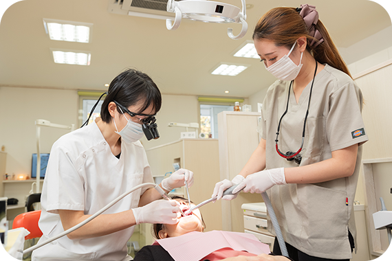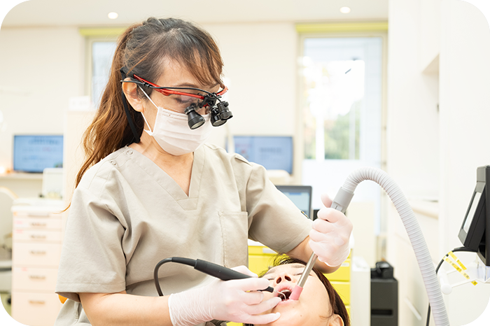 近年では、拡大鏡を使用して精密に治療を行う歯科医師が増えています。当院では、歯科医師だけでなく歯科衛生士も診療の際には、拡大鏡を使用しています。視野を大きく拡大できるため、細かい部分までしっかり確認しながら、より繊細で丁寧な処置が行える点が大きなメリットです。こうした精密な対応は、治療やケアの際の痛みの軽減にもつながります。