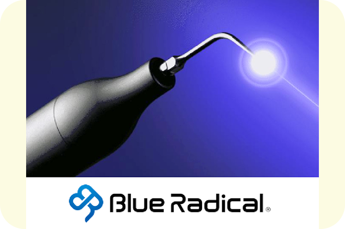 甲斐市にある当院では、歯周病治療に「ブルーラジカル」を導入しています。ブルーラジカルは、超音波振動による歯石の除去と、過酸化水素水・青色レーザーを併用した殺菌を同時に行う治療法です。外科的な処置が不要で、痛みもほとんどなく、短時間でより効果の高いクリーニング・除菌効果が期待できます。特に中等度以上の歯周病でお悩みのかたにおすすめの治療法です。